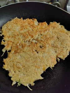 「豆腐焼き」 投稿日: 2025/09/23 投稿者: きょうこ マイブームのおかず「豆腐焼き」と呼んでいる。 水切り豆腐1丁、エノキ半分、玉子1つ、片栗粉大さじ3、ガラスープ小さじ1、青海苔大さじ1、ピザ用チーズ適宜を混ぜて焼く。 夫はポン酢、私はそのままでいただく。 ガラスープなしでも、代わりにべジタブルスープの素でも。 ネットか何かで見つけて以来、具材や分量は適当。 お好み焼きのアレンジ風、お弁当にも使えて重宝している。