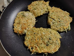 ニラ1束、玉ねぎ半分、片栗粉、卵、チーズ、牡蠣油を混ぜて焼く。
