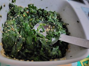 大葉醤油漬け 投稿日: 2026/02/26 投稿者: きょうこ 八百屋さんから売れ残った大葉を沢山いただいた。 ネットで「大葉大量消費」を検索し醤油漬けに挑戦。 大葉100枚を水洗い、ペーパーで拭き軸を切り落として千切り。 ゴマ油大3,醤油大2,白ごま小4,おろしニンニク小2と混ぜて冷やす。 1時間で完成!味が濃いので私はムリだが夫は喜んだ。 ポピュラーな大葉味噌より火を使わずできるのが気に入った。