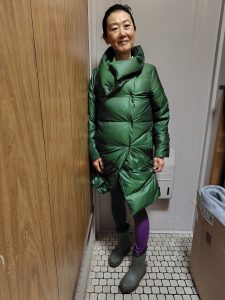 緑のダウンコート、紫スパッツ、緑の長靴。