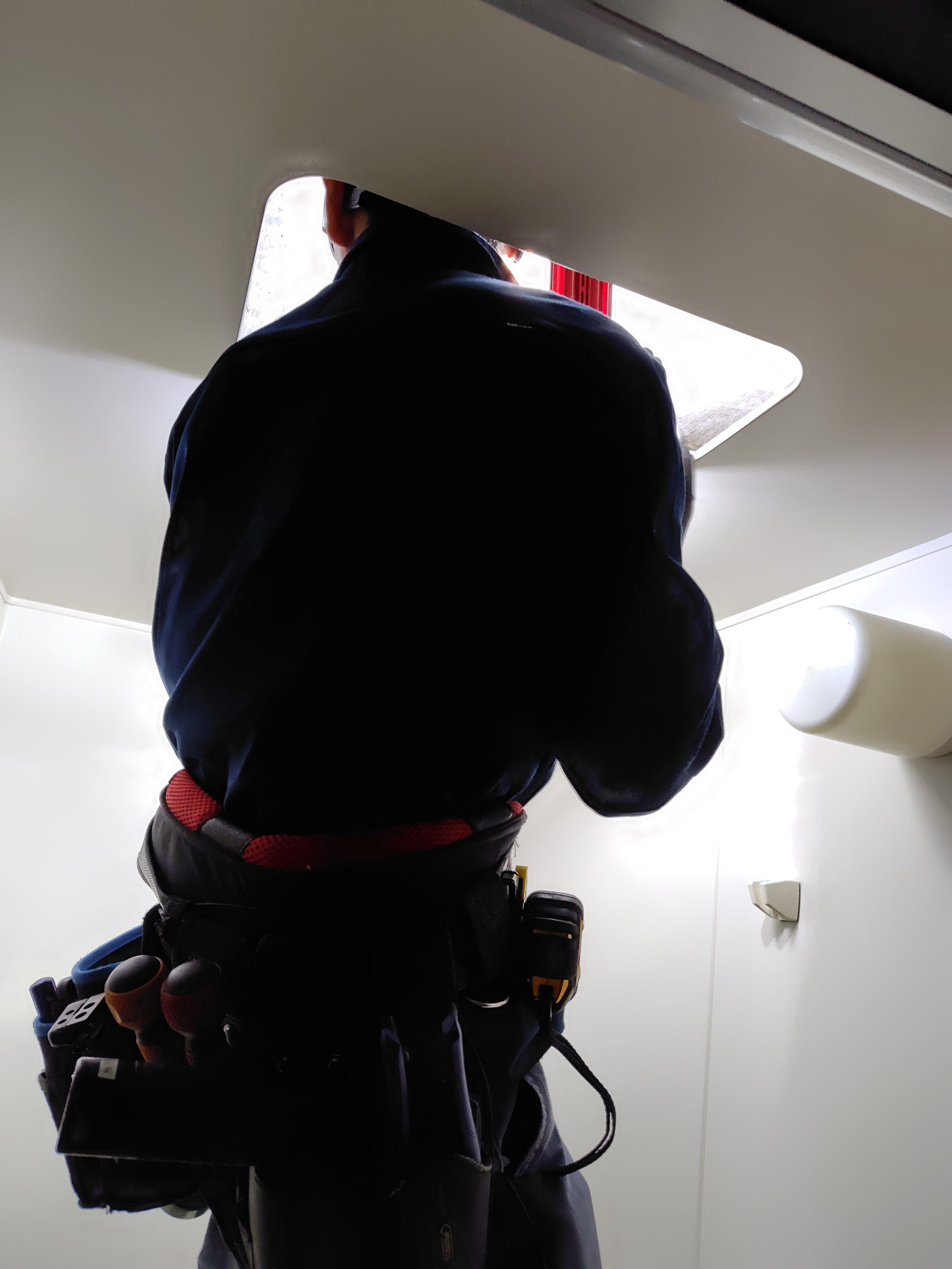 自宅に漏電の疑い有りで電気屋さんが検査。 お風呂の天井裏ってこんなになってんだ~。 猫と一緒で興味津々、私ものぞかせてもらった。 天井裏から乾燥したハクビシンの糞が一つだけ出て来た。 今ではなく以前住んでいたかも?ということらしい。 電気屋さんによると、よくネズミが配線をかじって漏電するとか。 今回は配線の老朽化?停電が直って助かった。