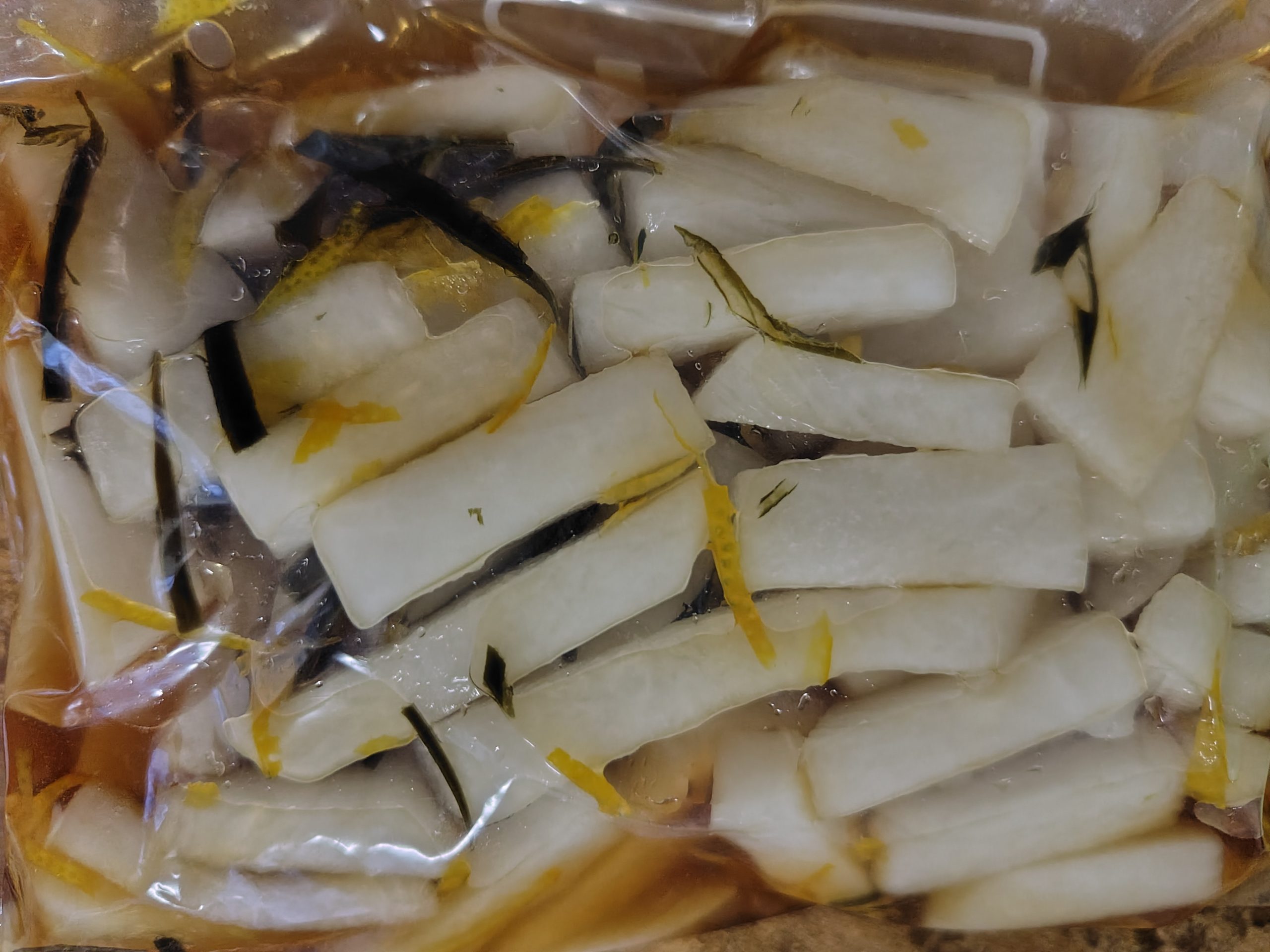 美味、柚子大根 投稿日: 2026/01/25 ネットで見たレシピで柚子大根を作った。 一年で最も寒いこの時期、良い大根が手に入りやすい。 立派な大根で作った柚子大根は夫にも好評だった。 500gの大根は皮剥いて拍子切り、小さじ2の塩を混ぜて30分置く。 その間柚子一つの皮を薄く剥いて千切り、残った実は半分に切り種を除く。 昆布5×5㎝を2つ分をハサミで細切りにする。 味醂150mlを4分ふつふつ煮て半量 … 続きを読む>